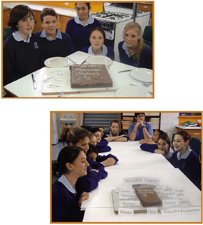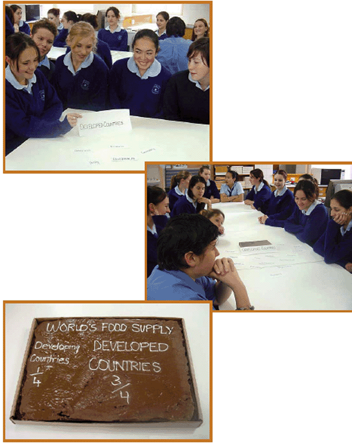 A chocolate cake is presented to the class. The class is divided into two groups: ¼ of the class is given ¾ of the cake, and the remaining ¾ of the class is given the last ¼ of the cake. The cake has been cut to represent the world food distribution: ¾ of the world's population consume ¼ of the world's food; ¼ of the world's population consumes ¾ of the world's food supply. Students reflect and discuss their reactions to the activity.